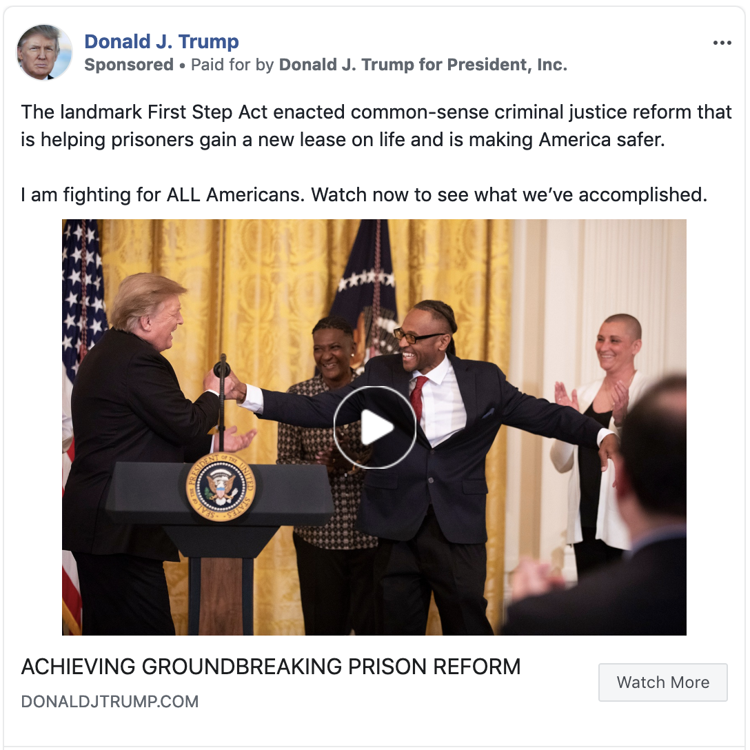 Earlier this week, Trumpâs campaign started running dozens of ads primarily targeting voters in Georgia, Florida, North Carolina, Virginia and Ohio touting the First Step Act - the criminal justice reform bill Trump recently signed. The ads are promoting a 3-minute video featuring Jared Kushner, news clips of Alice Johnson and mentions of Kim Kardashian - likely in an effort to try to court communities of color in battleground states.