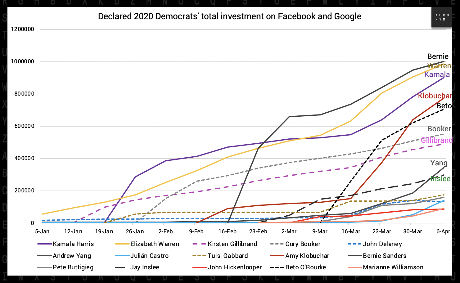 On the Democratic side, Bernie still leads the field in total digital investment since the launch of his campaign. Heâs just shy of spending a million dollars - as of April 6th he had spent $999,221. Heâs closely followed by Warren ($984,276 investment on Facebook and Google) and Harris ($900,552).
