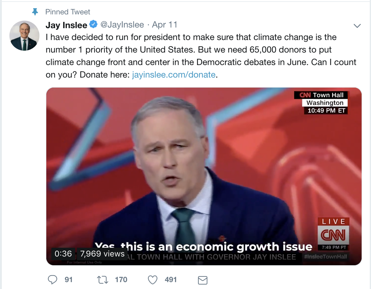 Candidates running single-issue campaigns may have goals beyond their own roles in the cabinet, the White House or elsewhere. Candidates like Swalwell, who is making his campaign centrally focused on curbing gun violence, or Inslee who is talking about climate change and protecting the environment, may be using the 2020 platform to increase pressure for broader policy changes or action around these issues. When youâre guaranteed a CNN town hall, earned media attention, and if you can make it onto the presidential debate stage, using those opportunities to drive awareness about specific issues rathercan help put pressure on legislators to prioritize those policies…if that message resonates with enough voters.