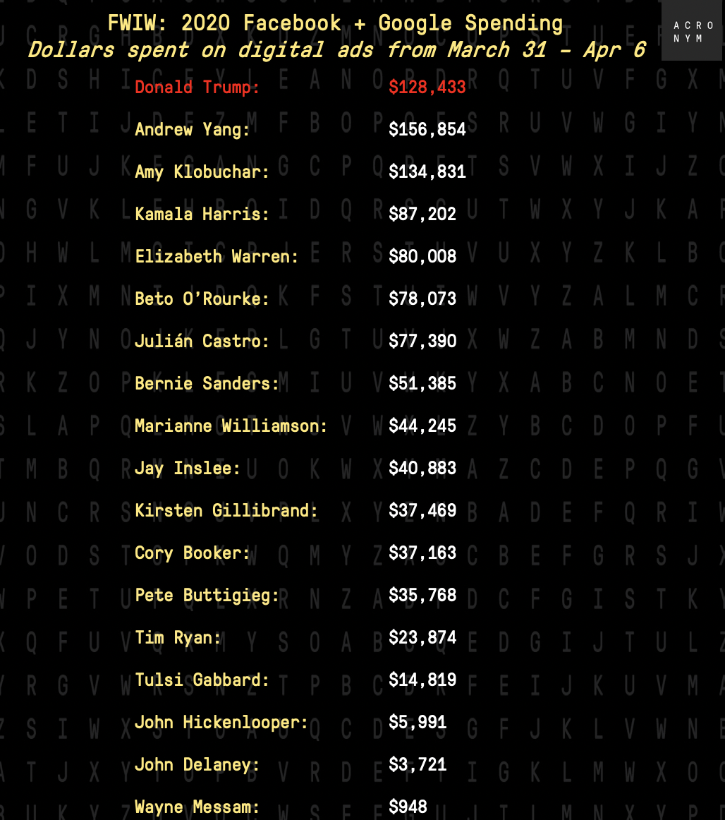 Welcome to FWIW, ACRONYMâs weekly newsletter breaking down digital ad investment across the political spectrum. Each week, we look at whose digital spending is up, whose is down, and whose is non-existent.